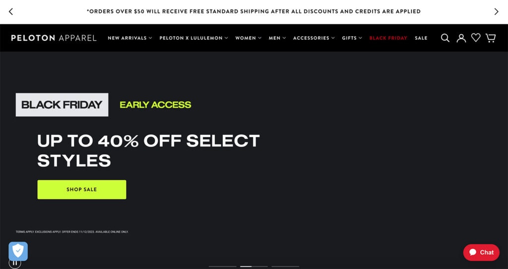 The themes you see here will include holiday colors, plenty of Black Friday and Cyber Monday language, and big numbers for percent off deals or special sales as you see in Peloton Apparell’s example above.