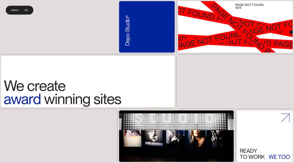 Here, Depo Studio finds the perfect mix with a static grid that features dynamic content elements in each block. The design has a distinct element of control, with photo and video elements moving into and out of different blocks on the grid.