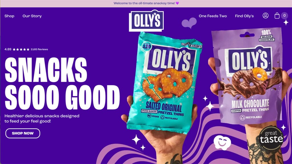 This example from Ollys, a snack company, is particularly fun and engaging. It uses a combination of bright color, typefaces that have a light and playful feel, and fun imagery (from the hands holding snacks to iconography).