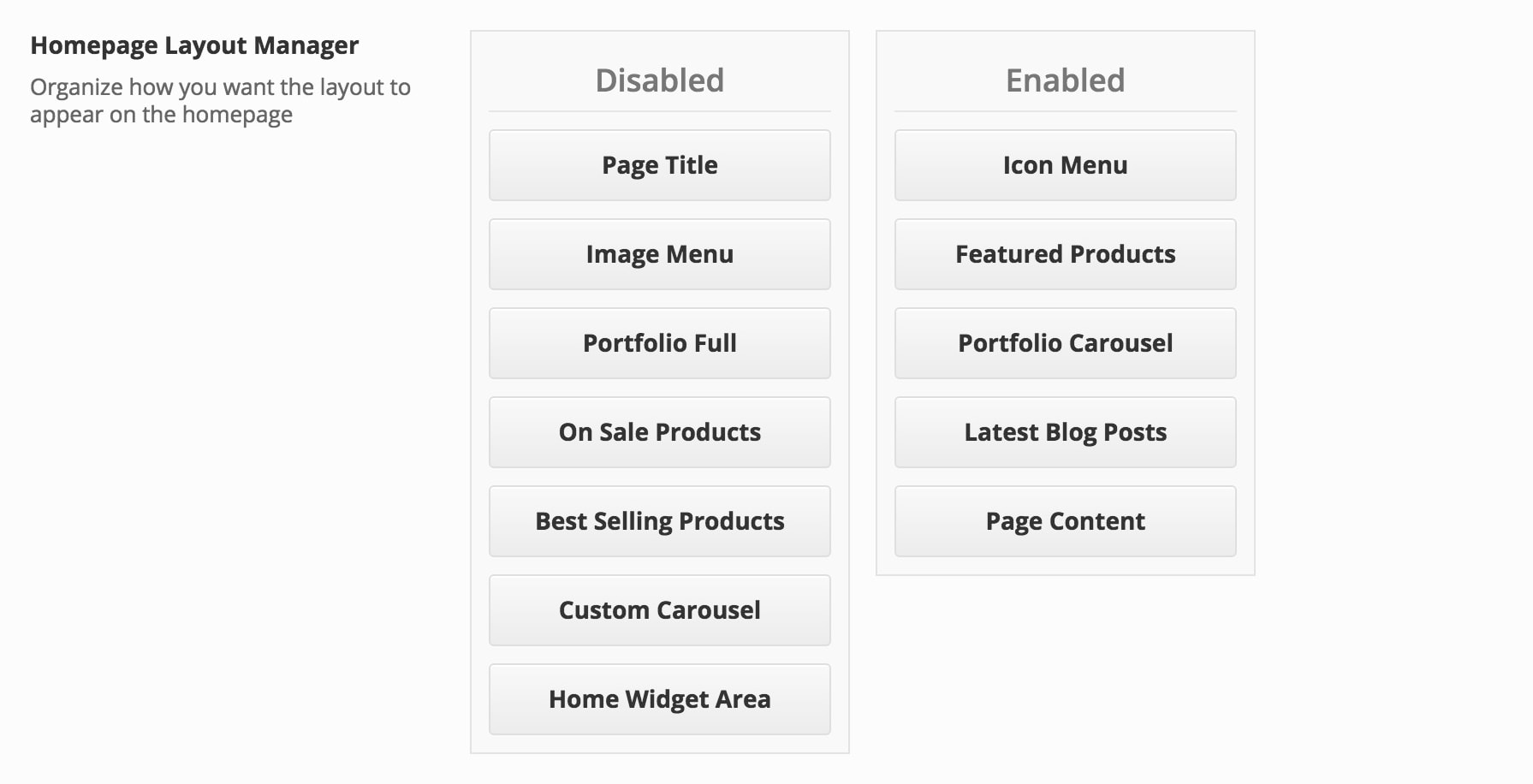 1. Go to Theme Options > Home Layout and in the Homepage Layout Manager enable Page Content, On Sale Products, Featured Products, and Latest Blog Posts (in that order). Note* see here to learn how to make products featured.