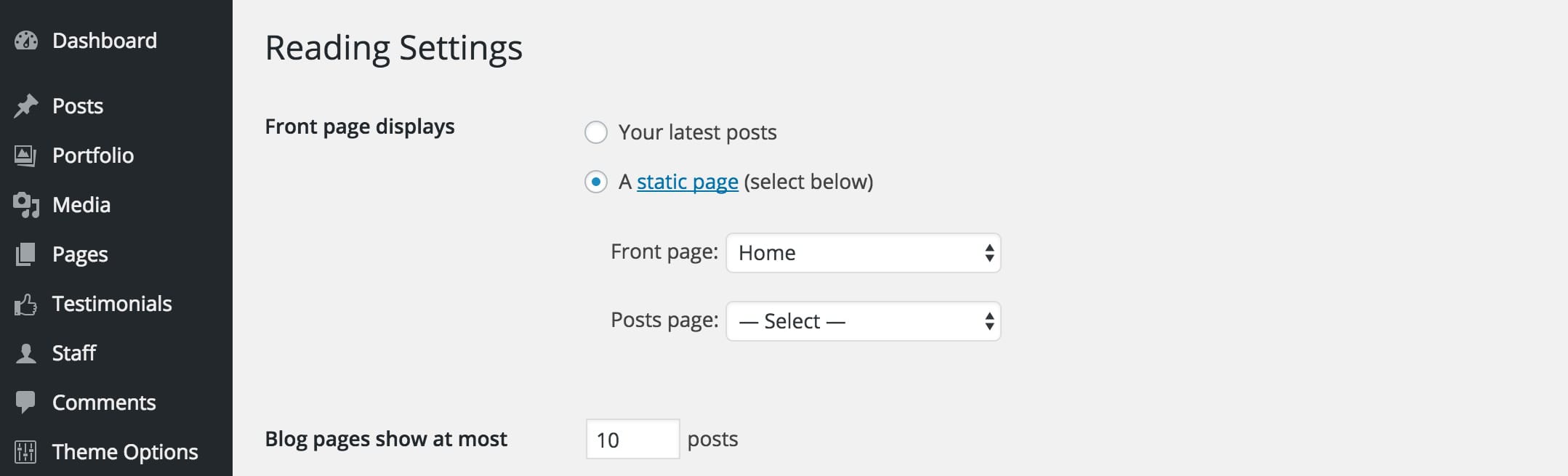 3. Beside Front Page choose “Home.” Do nothing for Post Pages.
