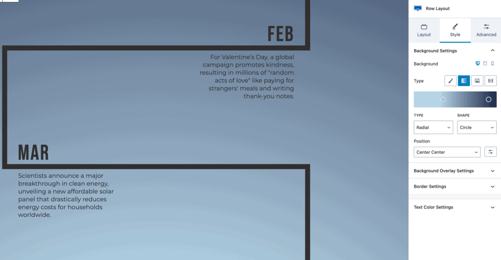 IMPORTANT: Most of our patterns don’t use custom CSS within the template, but to make these timeline patterns work, we had to add some custom CSS in the parent row layout.