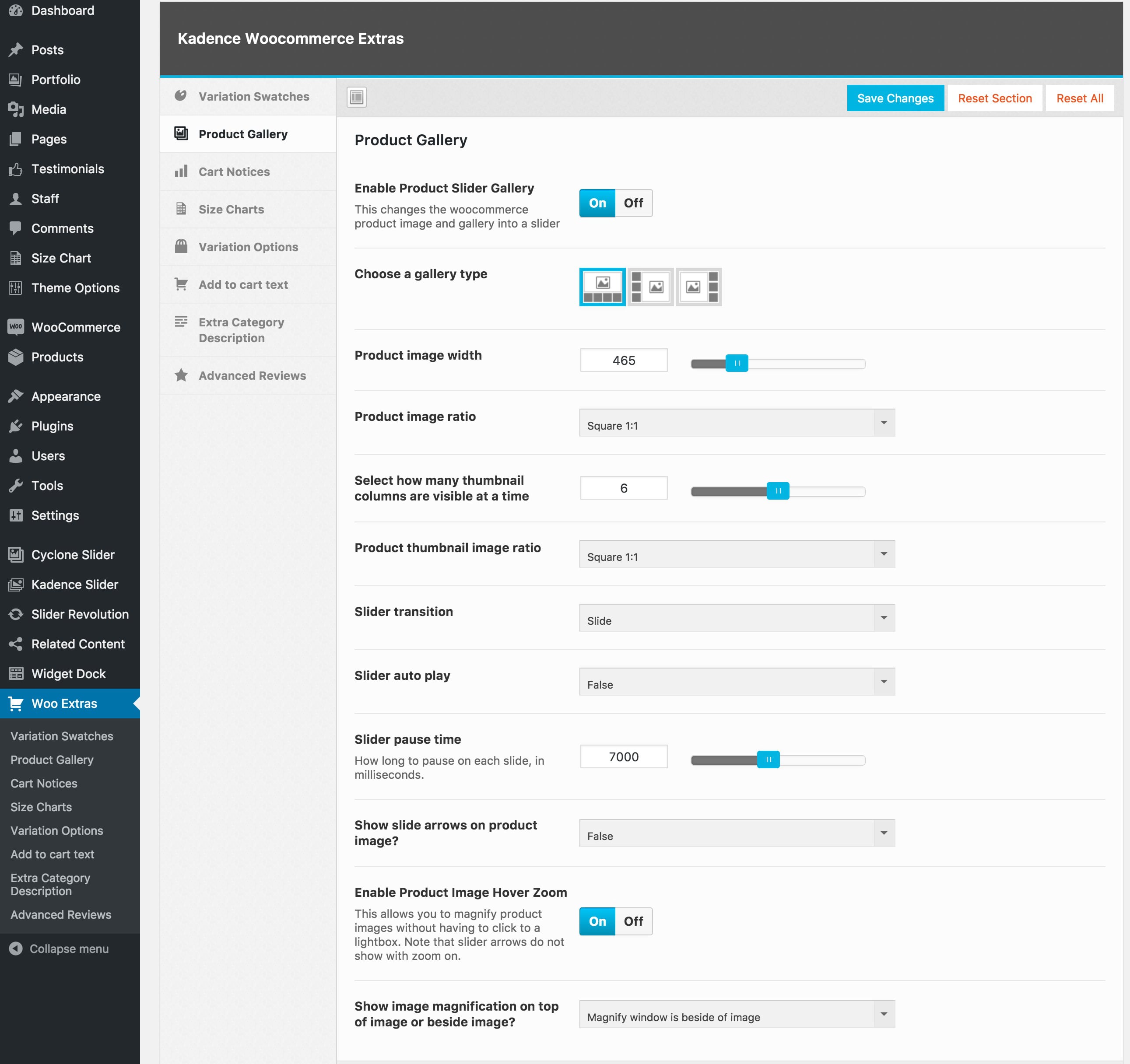 Kadence WooCommerce Shop Kit (formerly known as Kadence Woo Extras) features the ability to customize how your galleries appear for your products.  It also enables you to replace the product gallery with a slider.  Below are a few options that are available with the Kadence Shop Kit Product Gallery feature: