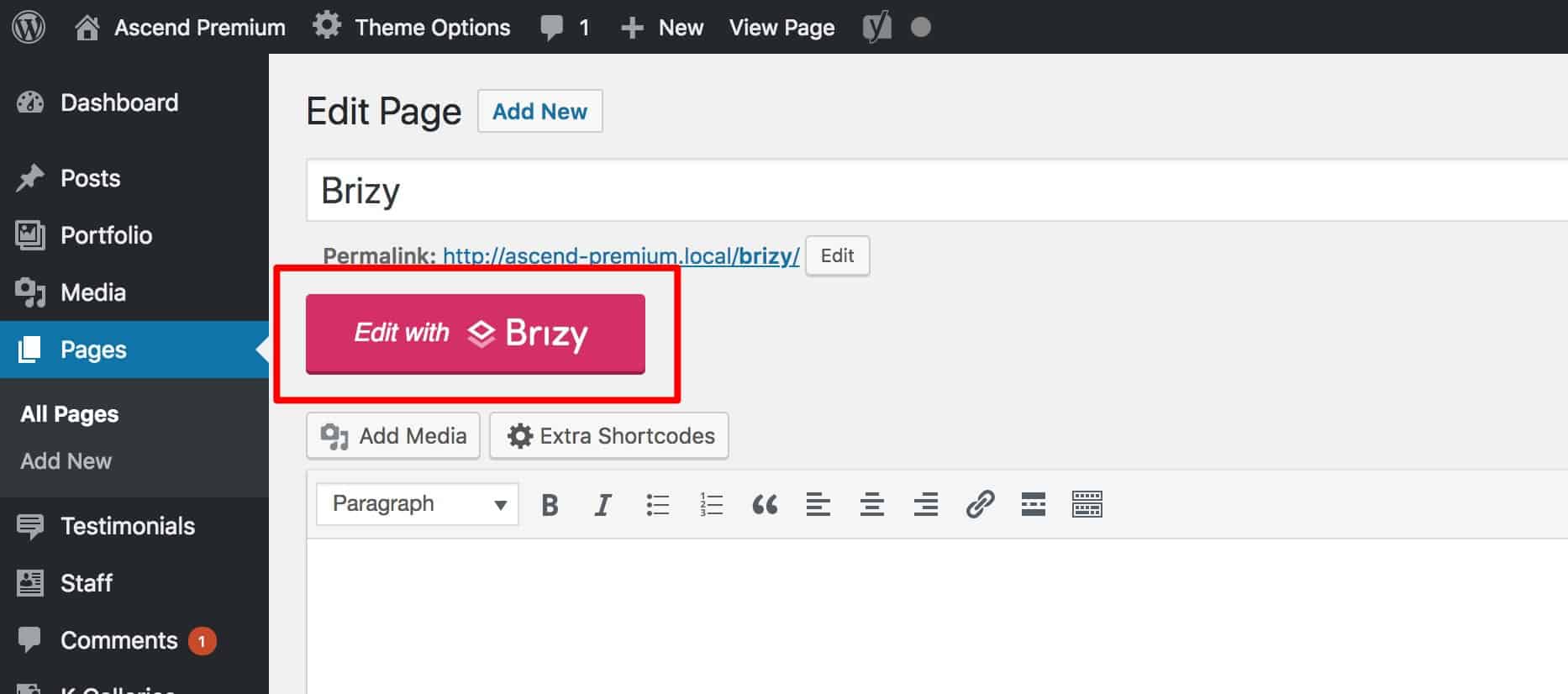 1. Once you have the plugin installed, navigate to the page that you want to edit and Click the “Edit with Brizy” button to get started: