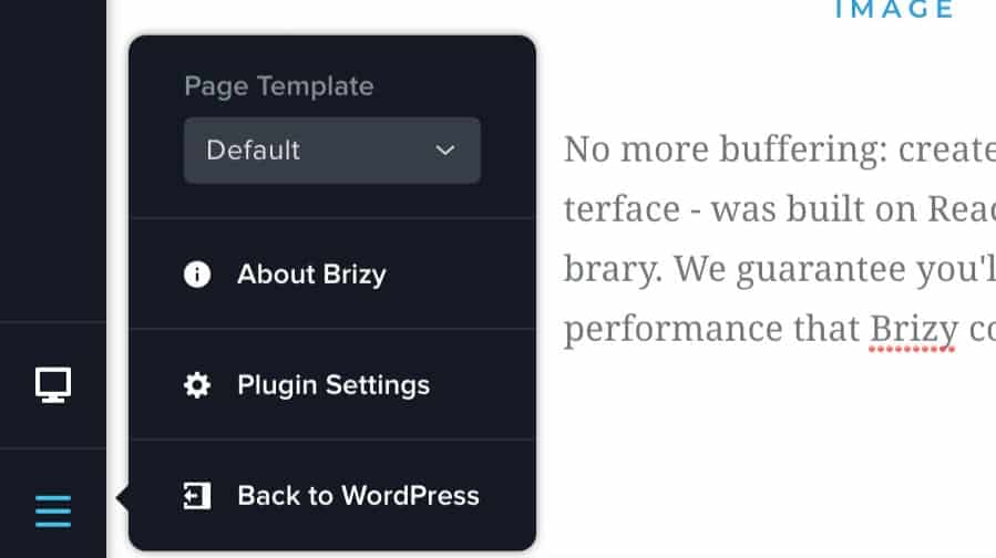 2. By default, the Brizy template will be selected. This template doesn’t display your header or footer, so if you’d like them to show, simply open the options in the bottom left corner and select the default template: