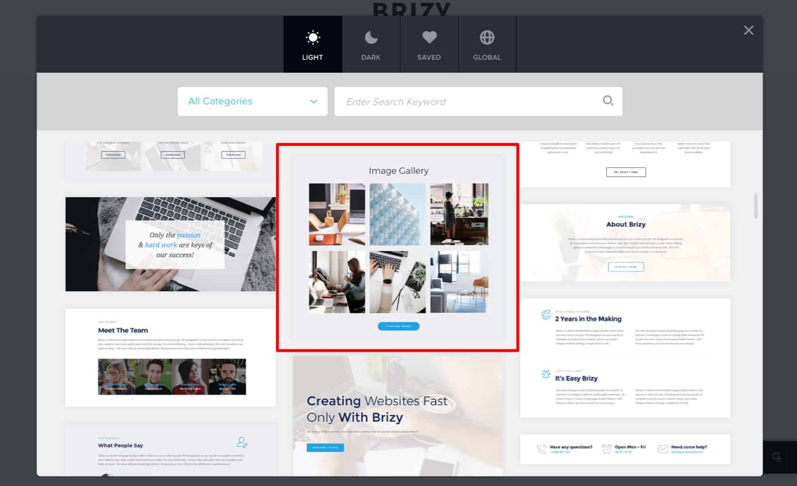 Brizy doesn’t have a designated gallery element. To create a gallery with Brizy, you have to add a column for each image and place an image within each column. An easy way to quickly create a gallery is to import the default gallery block and just replace the images with your own:
