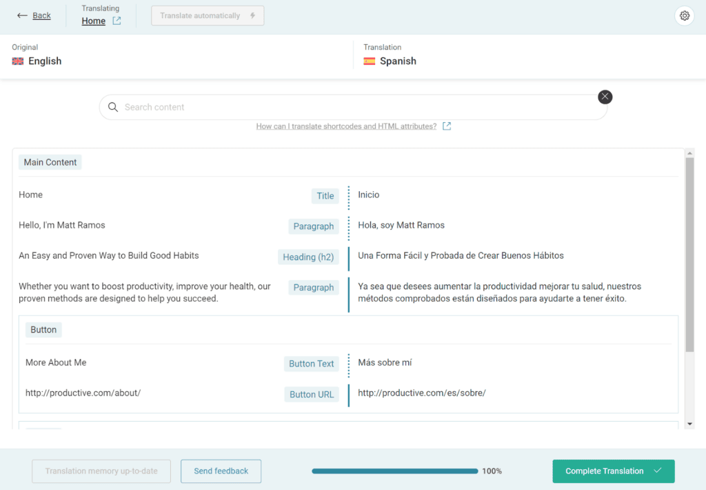 Once you complete the setup wizard, you’re ready to start translating your website.