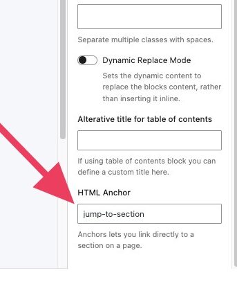 You can expand the Advanced Tab to add an HTML anchor or additional CSS class(es) to your Text (Adv) Block.