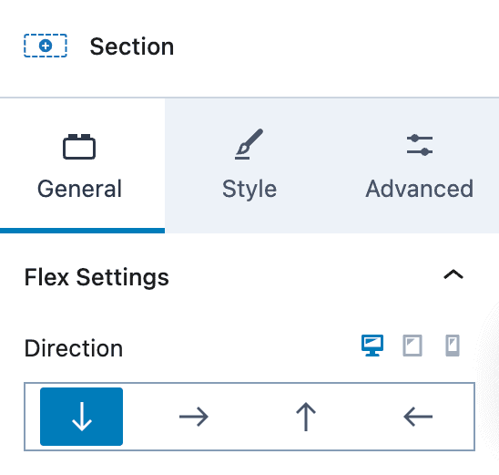 Flex settings control how child blocks inside a Section Block are arranged. These options are available in the Section Block settings panel and can be adjusted at any time.
