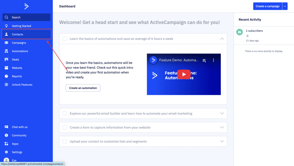 From the ActiveCampaign Dashboard, navigate to the Contacts Menu.