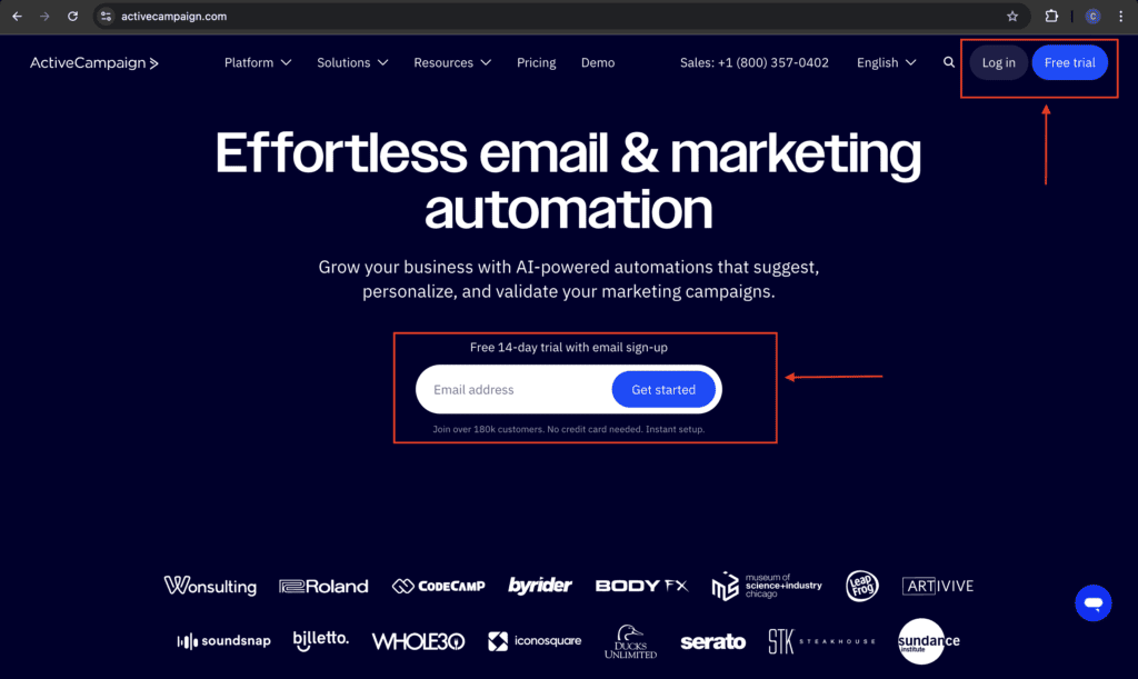 Get started by heading over to the ActiveCampaign. You can create a new account by signing up for the free trial or logging in to an existing one.