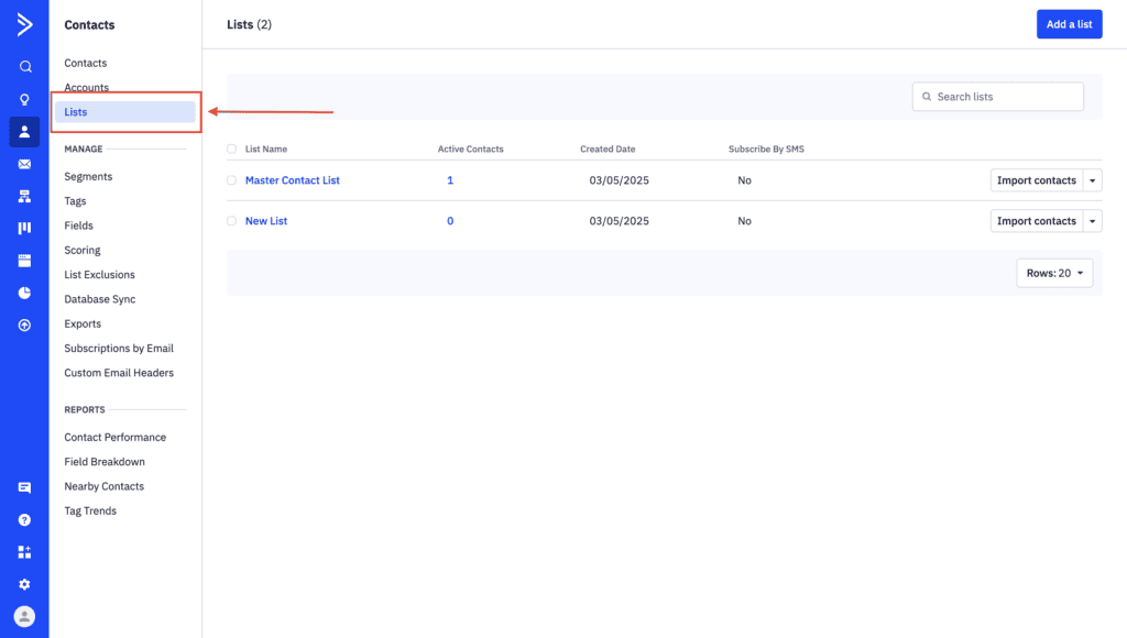 Under the Contacts parent menu, navigate to the Lists submenu and click on it