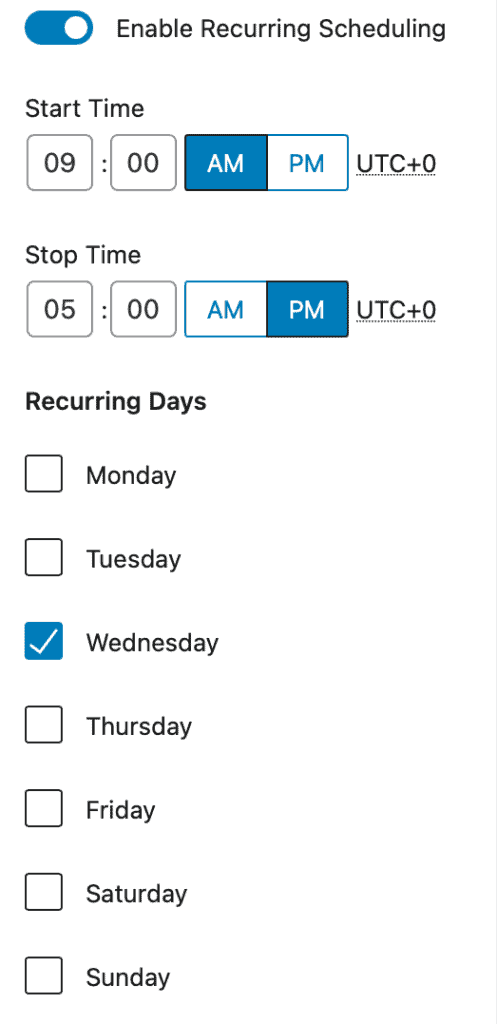 You can easily combine range and recurring scheduling for a unique display of your Kadence Conversion item. For example, if you want your conversion item to show on every Wednesday from 9 AM – 5 PM in the month of April 2022 only, first set your range from April 1, 2022 to April 30, 2022.