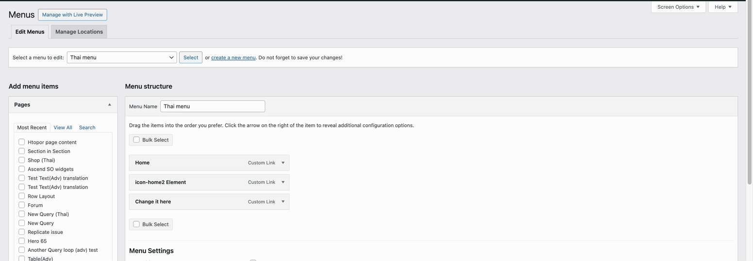 - Add New Items: Use the panel on the left (Pages, Posts, Custom Links, Categories) to add new items to the menu.
