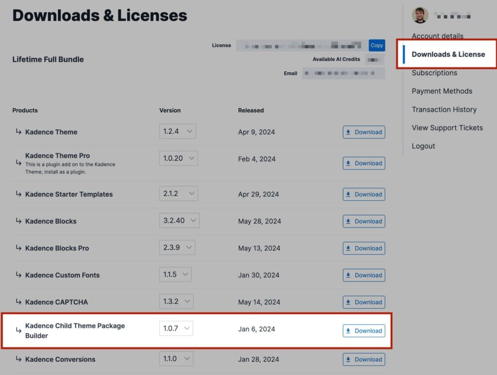 Once you have access to the Kadence Child Theme Builder plugin, you can download it from your Kadence Downloads & License page.