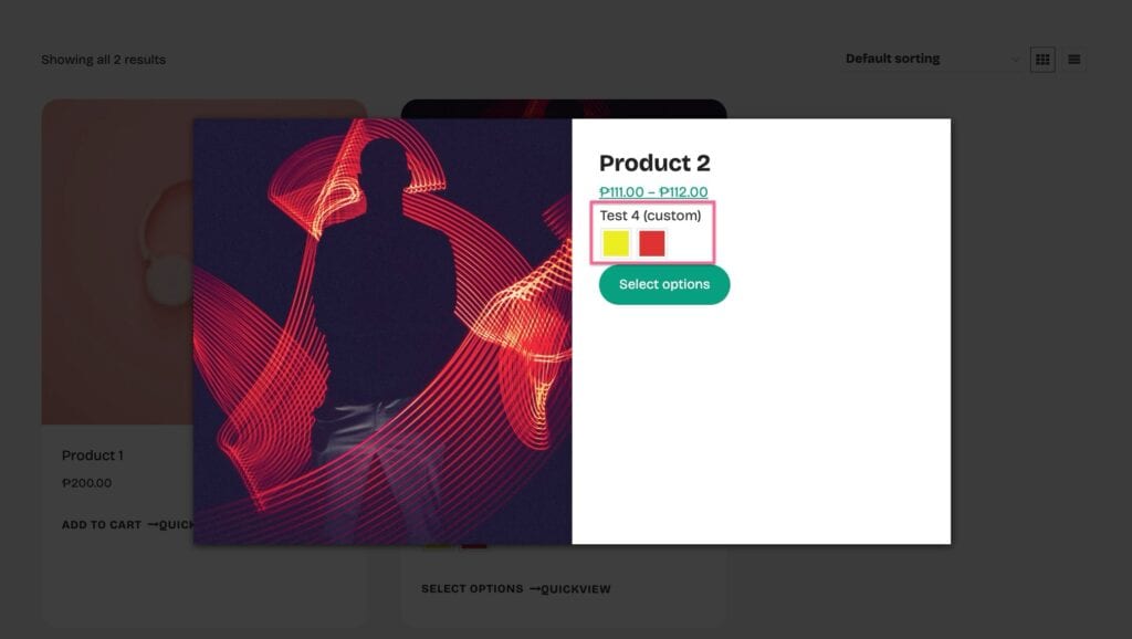 If variation swatches are enabled on archives, they’ll also show in the Quickview. Here’s how it looks: