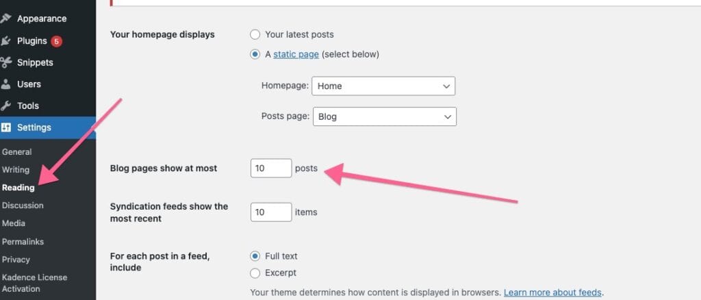 From the left-hand menu, click Settings, then select Reading. - Find the “Blog pages show at most” option.
