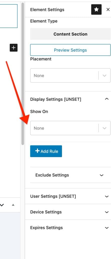 Important: In the Element settings, set Display Settings to None. This ensures there is no conflict between the code logic and the editor rules.