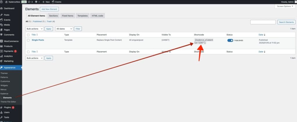 You can find the Element ID by navigating to Dashboard -> Appearance -> Kadence -> Elements and checking the element details.