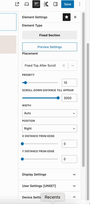 Then, use the Placement Settings to adjust the placement/behavior of the element and use the Display Settings to control the display settings of the element.