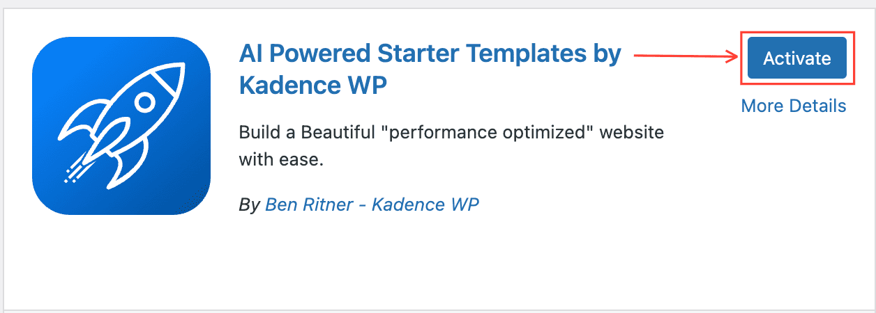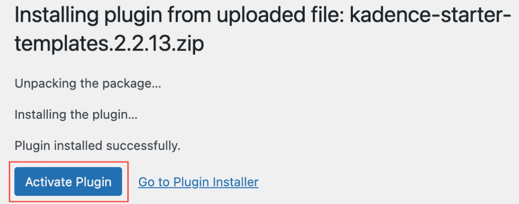 Then click on the blue Activate Plugin button to activate the Starter Templates by Kadence WP.