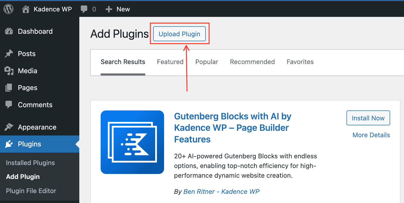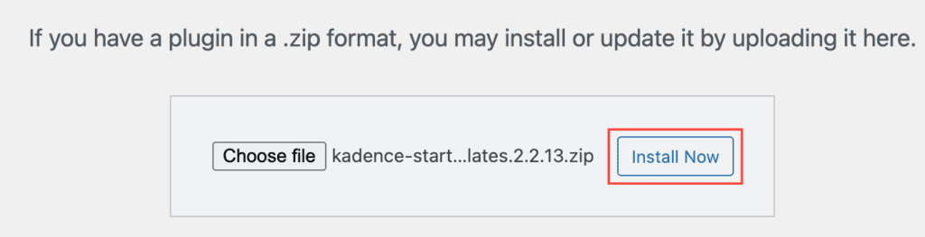 At the top of the page, you will now see an Upload Plugin button. Click on it to upload your ZIP file. You can click the Choose File button and choose the Kadence Starter Templates ZIP file you downloaded.