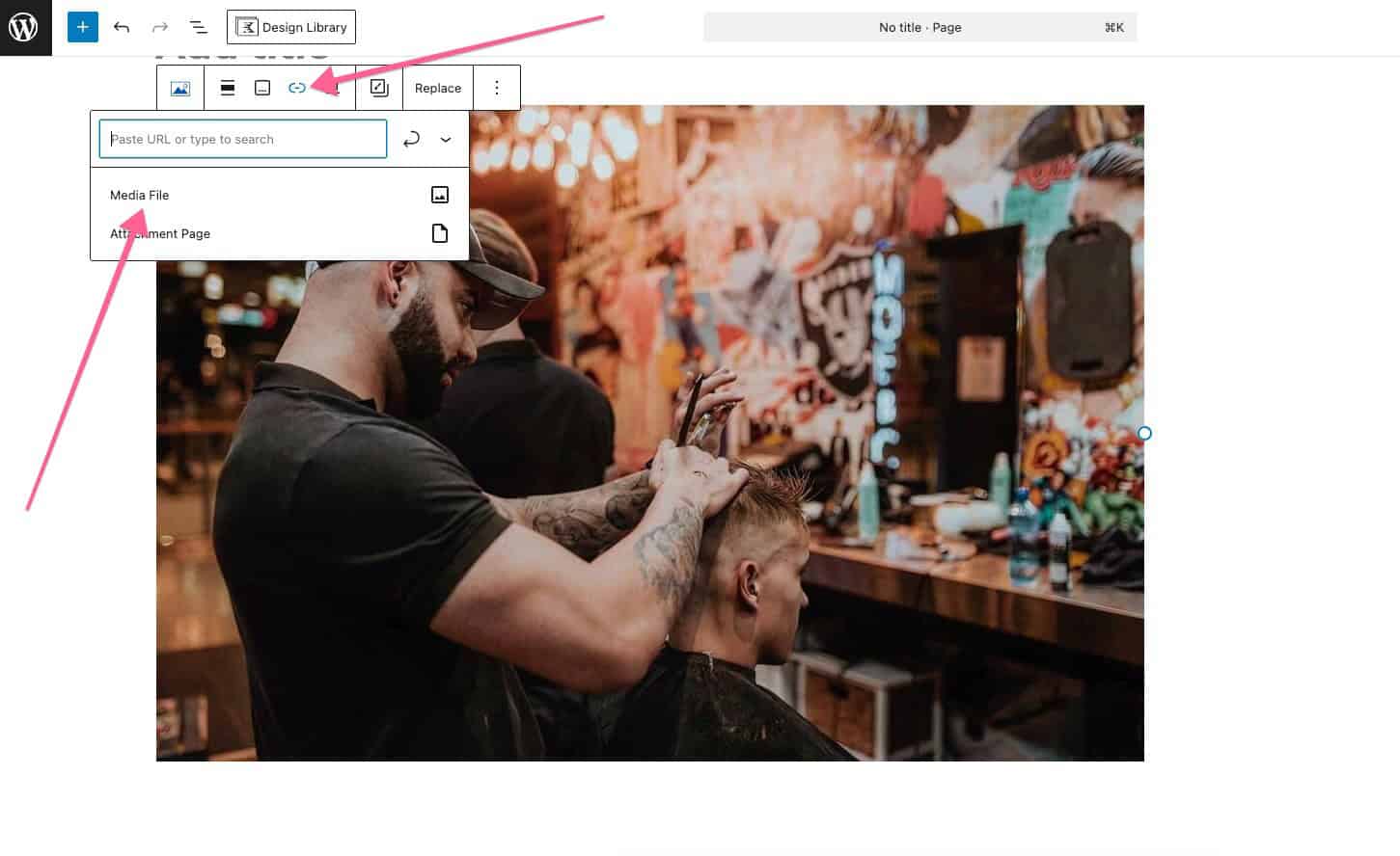 - In the top block toolbar, find the Link To option. This is represented by a chainlink icon.